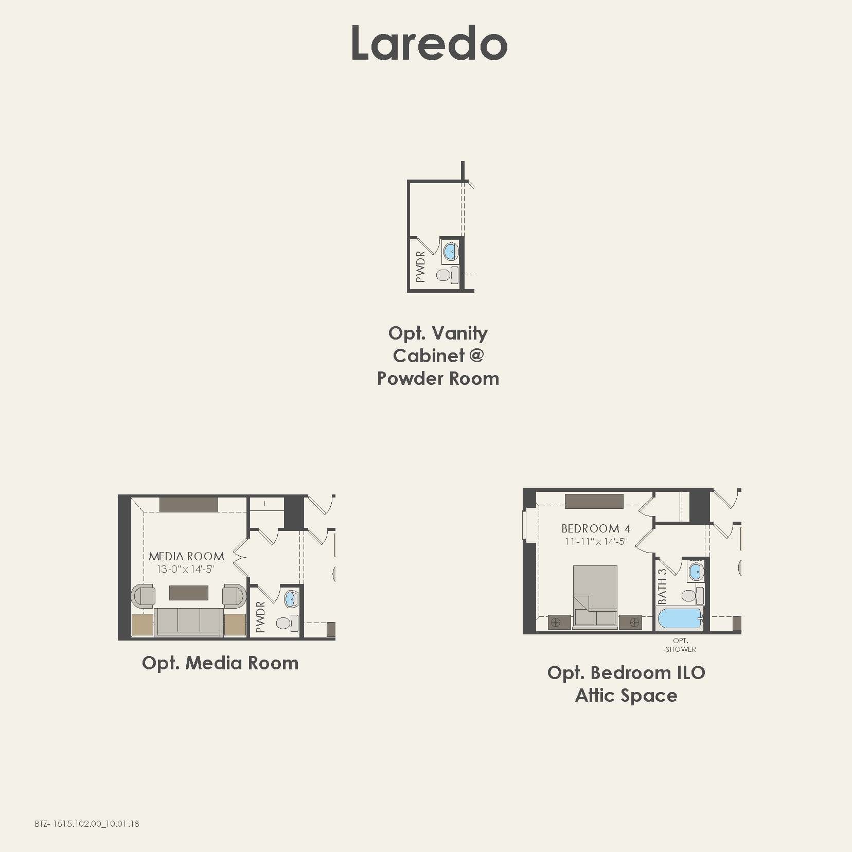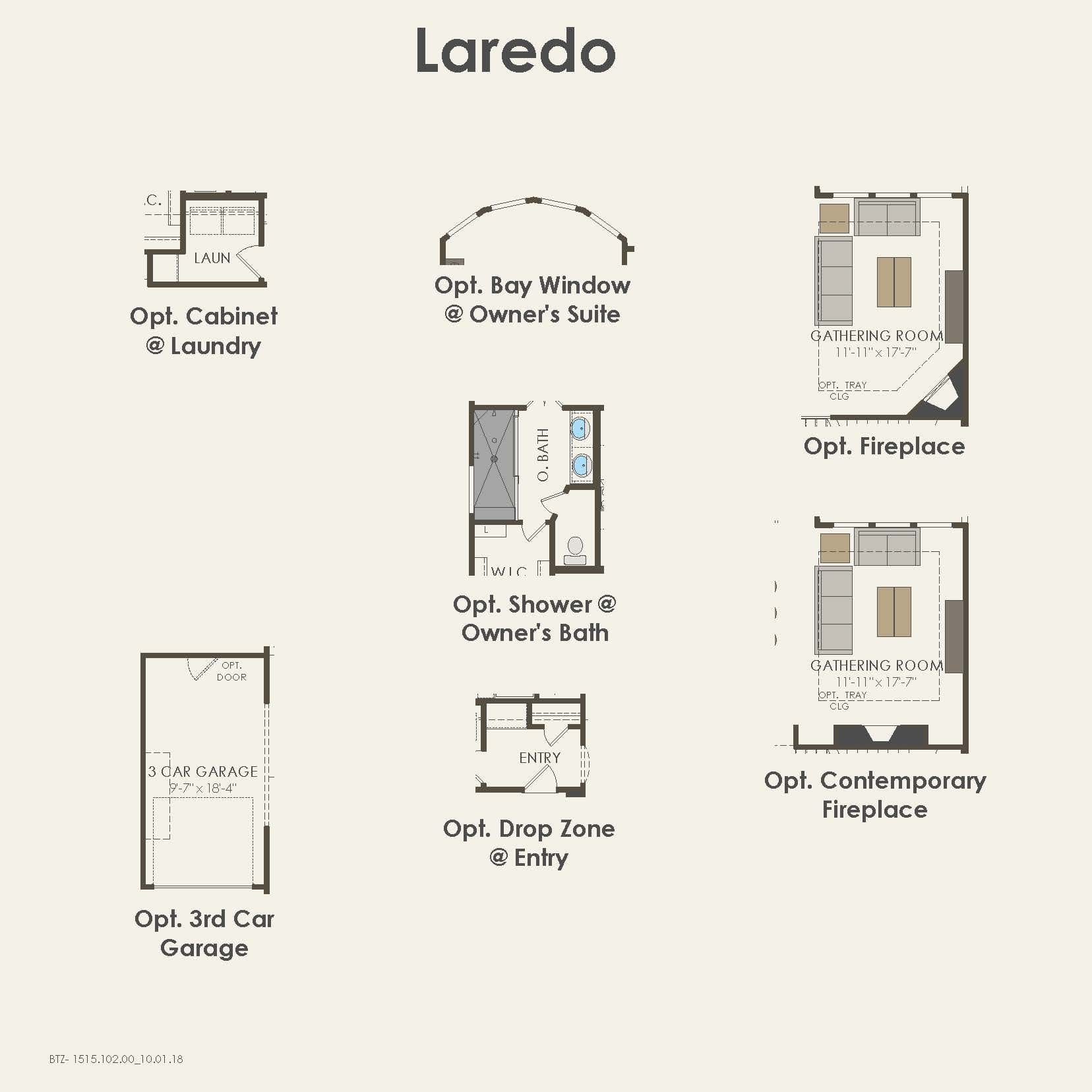 - The Laredo is a two-story plan featuring open living spaces overlooking the covered back patio. The kitchen’s extended island bartop is perfect for a meal on-the-go. Upgrade to the optional bay window in the owner’s suite for a more spacious retreat.